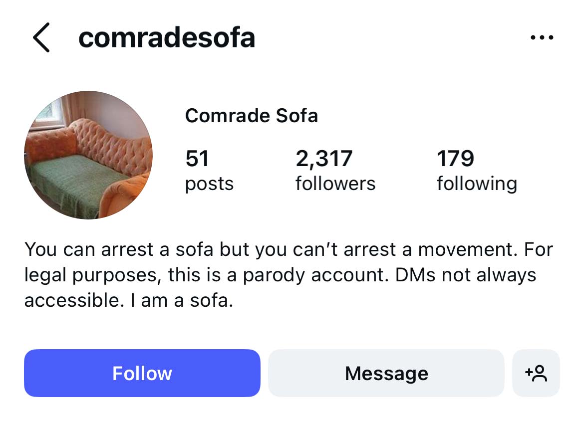 قبل أن أنتقل إلى تجلّيات السوريالية القمعية في هذا المثال الغريب، أريد أن أشير إلى عبقرية إنشاء حساب «شخصي» للكنبة من قِبل المجموعة المتظاهرة. إذ أنّه في أنسنة جماد مثل الكنبة محاولة لتمديد الدعم الفلسطيني نحو أفراد غير أو أبعد من إنسانيين، وفي هذا تجلٍّ واضح– ولو اتّخد صورة مغايرة– لعبارة عنف ما «يُنطِق الحجر». هنا، يتخلخل فهمنا لما هو «إنساني»، خاصّةً في هذا الوقت الأحمر الذي يُجرَّد فيه الفلسطيني تماماً من الصفات «الإنسانية»، وحيث يدافع عن اغتصاب الرجال وتجويع الأطفال وإجهاض النساء من هم غيورون على «إنسانية» الآخر الصهيوني.