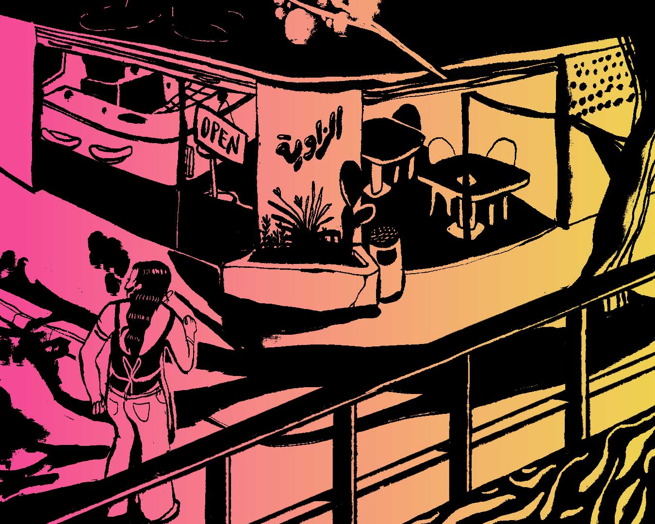 سمعتُ صوتَ سيترن المَي في الشارع المُحاذي وتذكّرتُ حصانَ زياد. فُتحَ باب المقهى فاستدرتُ لأجد جنى، زوجة زياد، أو صديقته، تتّجه صوبي.